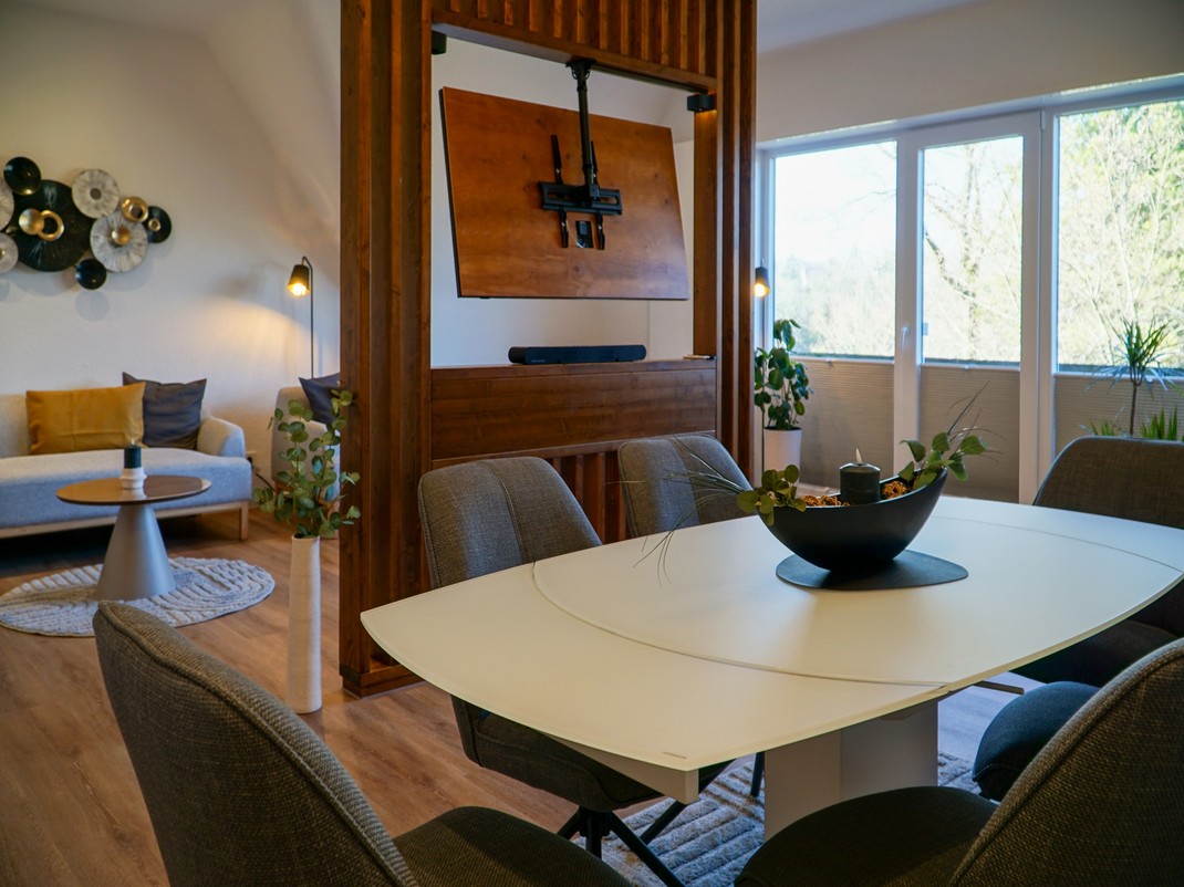 Mit seiner wohnlichen Atmosphäre bildet er den perfekten Rahmen für einen entspannten Abend in geselliger Runde und lädt zudem mit seiner medialen Ausstattung zum konzentrierten Arbeiten ein.