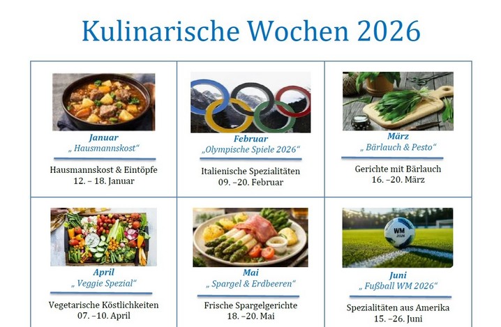 Im Mittelpunkt stehen monatliche kulinarische Aktionen, die sich entweder an jahreszeitlichen Schwerpunkten oder an sportlichen Highlights orientieren. Ob winterliche Hausmannskost, frische Frühlingsgerichte, saisonale Klassiker wie Spargel oder Erdbeeren oder internationale Spezialitäten passend zu sportlichen Großereignissen – der kulinarische Kalender verbindet Genuss, Vielfalt und aktuelle Themen aus Sport und Jahresverlauf.